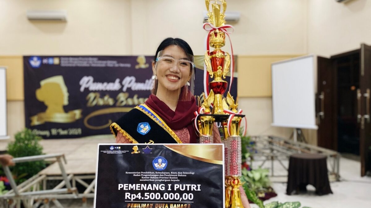 Veronica mahasiswi DKV UMN saat menerima penghargaan lomba juara 1 Duta Bahasa Provinsi Banten. (dok. Veronica Ng)