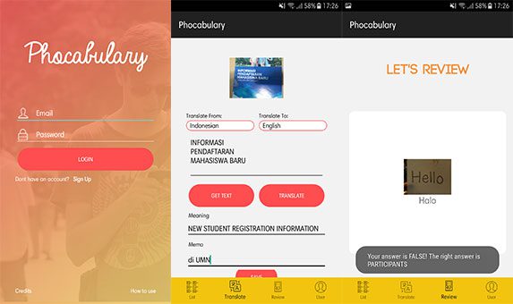 Pembuatan aplikasi Phocabulary sendiri dilakukan Suderi, Patrick, dan Nathania saat medapat tugas kuliah project Mobile Programming. “Namun finishing dari aplikasi ini sendiri kami kerjakan kira-kira 2 minggu sebelum lomba dimulai,” ungkap Patrick.