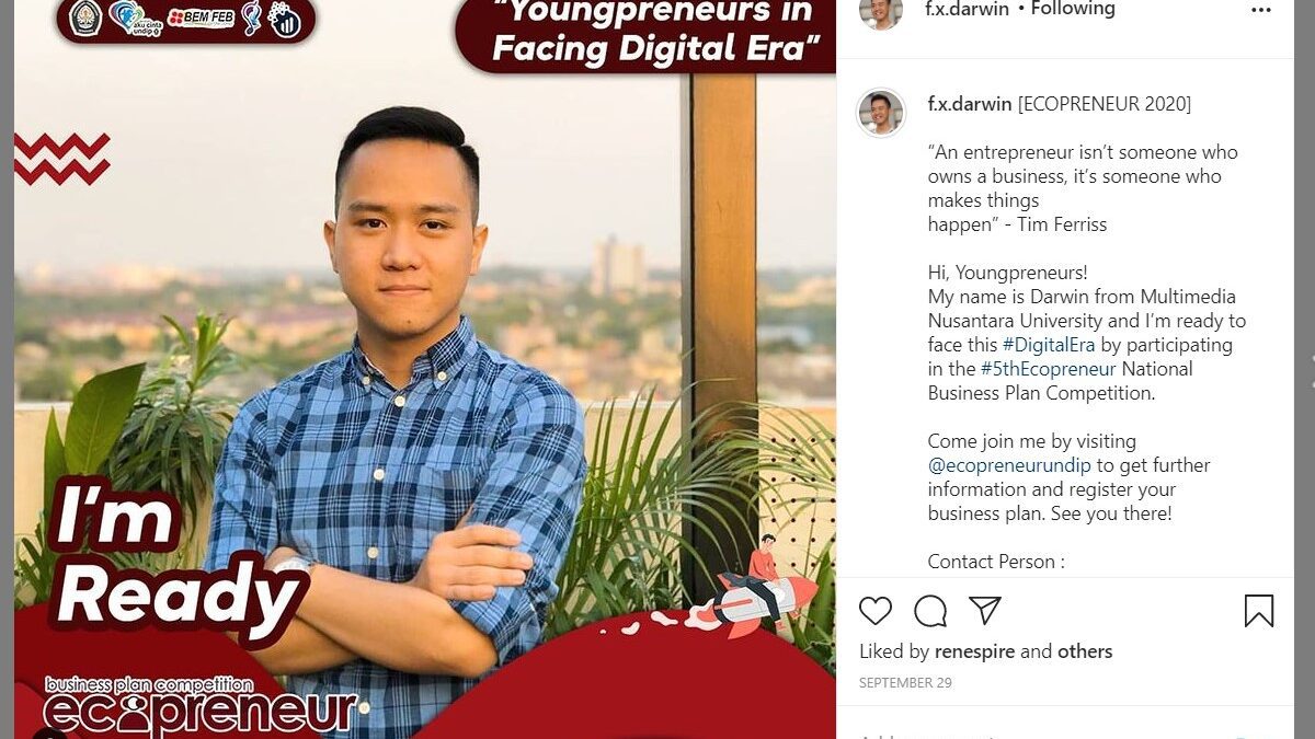 November 21, 2020TANGERANG – Lagi, mahasiswa Universitas Multimedia Nusantara (UMN) raih prestasi di ajang kompetisi bisnis yang diselenggarakan Universitas Diponegoro (UNDIP). Ecopreneur 2020 ini merupakan kompetisi bisnis ini diselenggarakan ke-lima kalinya oleh BEM FEB UNDIP. Kali ini, acara ini mengangkat tema “Youngpreneur in Facing Digital Era”.