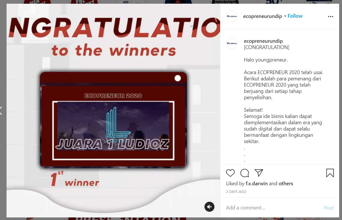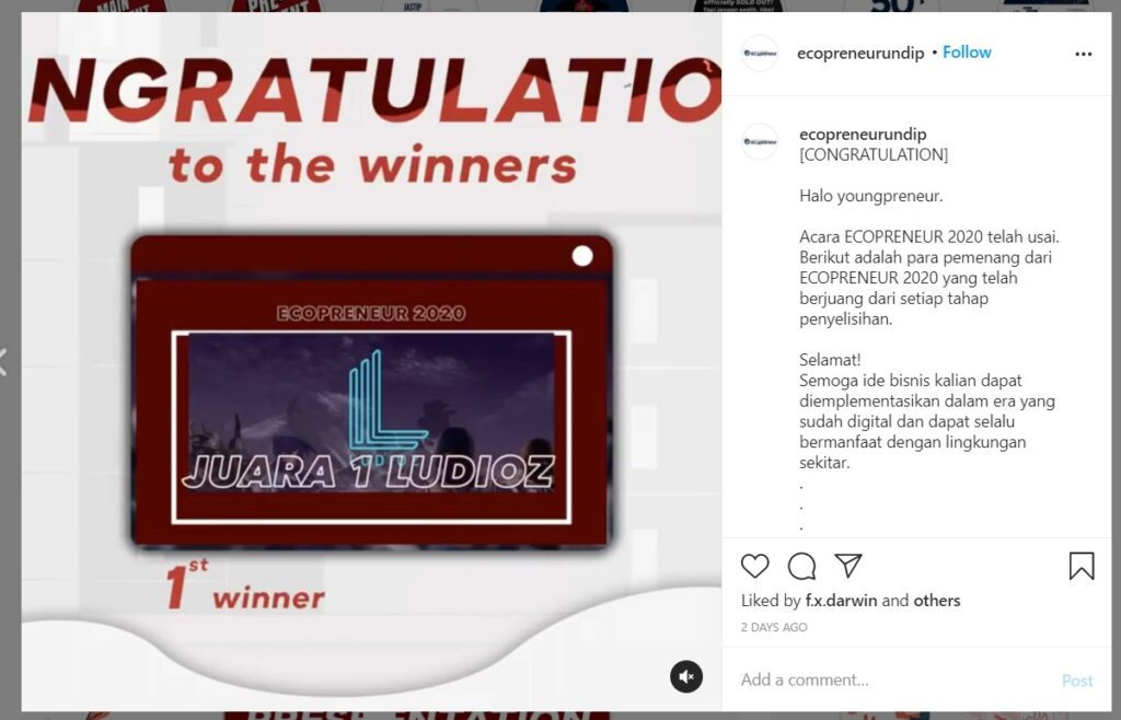 “Pada awalnya, kami diminta untuk mengumpulkan Business Model Canvas untuk diseleksi 30 tim terbaik agar bisa lolos ke semifinal. Setelah kami lolos ke semifinal, kami harus mengumpulkan Business Plan sedetail mungkin agar bisa lolos ke tahap final bersama 14 tim lainnya. Kami pun lolos ke final dan mendapatkan reward untuk mengikuti workshop yang sangat bermanfaat dengan pembicara dari OJK dan Unilever. Kemudian kami melakukan pitching ide bisnis di hadapan juri yang merupakan praktisi bisnis dan berhasil menjadi juara 1.” tambah Darwin mengisahkan.
