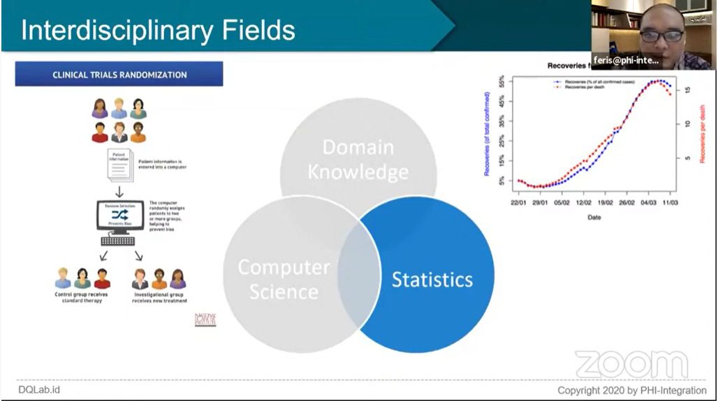 Untuk membuka materi, Feris menjelaskan, data science adalah ilmu yang multidisiplin yang menggunakan metode science, proses science, algoritma dan sistem untuk menghasilkan knowledge dan insight dari data yang terstruktur seperti excel atau database serta data tidak terstruktur misal media atau sosial media. Ada 3 ilmu mutidisiplin, yaitu domain knowledge, statistics, dan computer science.
