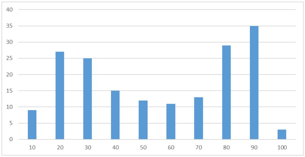 The results from the SDG literacy test show a fairly strong understanding of sustainability issues among students, with a majority scoring in the moderate to high range (80-90). While this indicates that many students have a solid grasp of the SDGs, there are still a notable number of students in the lower scoring categories, suggesting that some areas of awareness could be further improved.