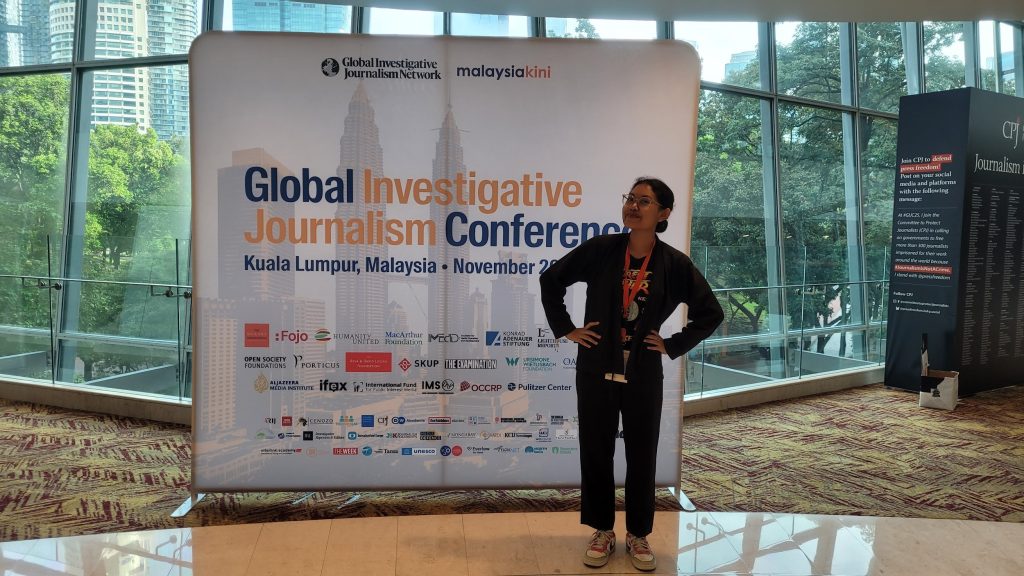 Mahasiswa Jurnalistik UMN, Theresia Sekar Kinanti Deviatri sedang berpose di depan banner GIJC. (dok. Theresia Sekar Kinanti Deviatri)