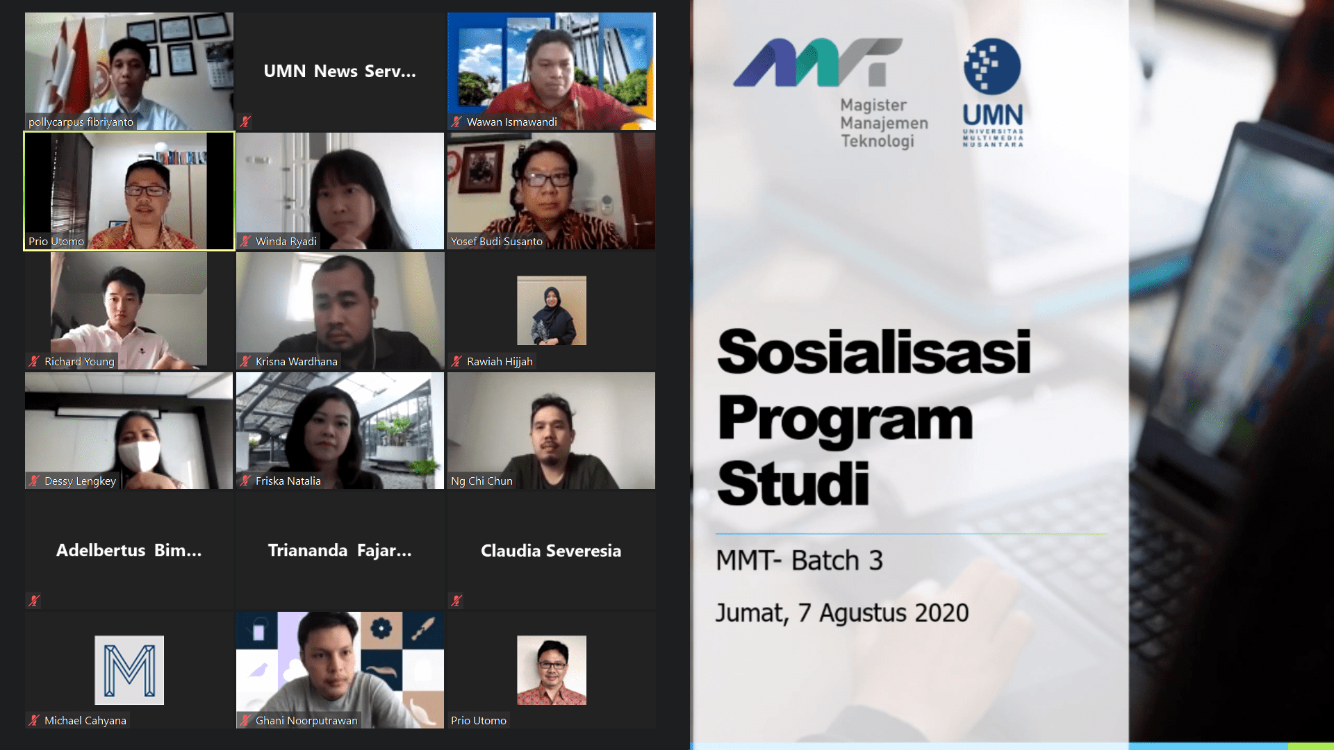 TANGERANG – Program Studi Magister Manajemen Teknologi (MMT) Universitas Multimedia Nusantara (UMN) menggelar sosialisasi perkuliahan kepada mahasiswa baru yang akan menempuh program pascasarjana di MMT UMN, Jumat (7/8). Sosialisasi ini berlangsung via Zoom secara daring dan dipandu oleh Wakil Ketua Program Studi MMT UMN, Prio Utomo.