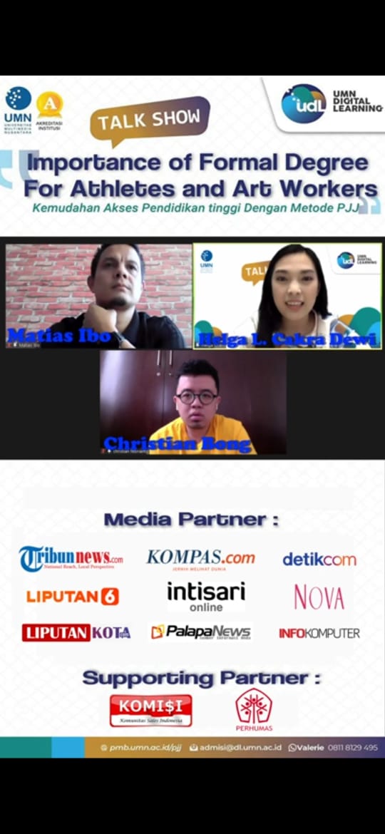 Pada Jumat, 13 November 2020, UDL melaksanakan talkshow yang ketiga, periode November. Tema yang diusung dalam talkshow kali ini adalah “Importance of Formal Degree for Athletes and Art Workers: Kemudahan Akses Pendidikan Tinggi dengan Metode PJJ”. Talkshow tersebut disiarkan langsung pada pukul 10.30 – 11.30 WIB melalui ZOOM Meeting (tinyurl.com/UDLTalkshow) dan juga disiarkan secara langsung di akun Instagram @universitasmultimedianusantara. Pada talkshow kali ini, bidang olahraga diwakili oleh Matias Ibo yang merupakan former physiotherapist of Indonesia National Team & Semen Padang FC. Untuk perwakilan dari dunia art workers diwakili oleh Christian Bong yang merupakan founder Indomusikgram. Serta, Helga L. Cakra Dewi M. Comm selaku Ketua Program Studi PJJ Strategic Communication sebagai pembicara sekaligus moderator.