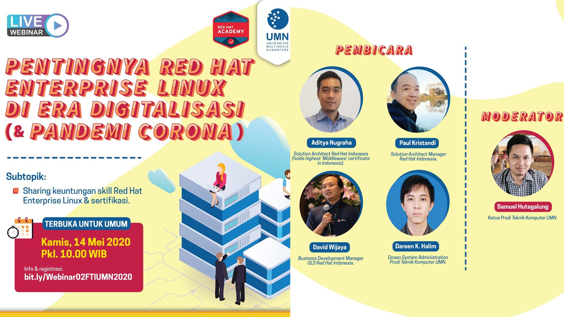 TANGERANG – Teknik Komputer Universitas Multimedia Nusantara (UMN) mengadakan Webinar bertajuk “Pentingnya Red Hat Enterprise Linux di Era Digitalisasi & Pandemi Corona” bersama Red Hat Indonesia pada Kamis (14/5).