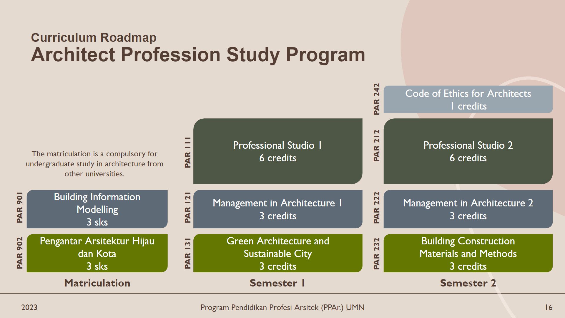 Kurikulum Program Studi Pendidikan Profesi Arsitek (PPAr) Universitas Multimedia Nusantara (UMN) dirancang untuk menghasilkan profil lulusan dengan kompetensi utama sebagai arsitek profesional. PPAr UMN juga akan membekali lulusannya dengan kompetensi tambahan di bidang BIM dan bangunan hijau.