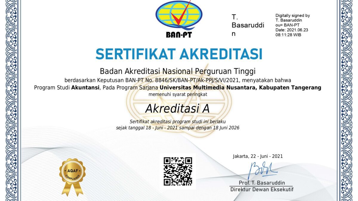 TANGERANG – Program Studi Akuntansi Universitas Multimedia Nusantara kembali meraih akreditasi A dari Badan Akreditasi Nasional Perguruan Tinggi (BAN-PT). Legalitas akreditasi ini tertuang dalam Surat Keputusan Nomor 8846/SK/BAN-PT/Ak-PPJ/S/VI/2021.