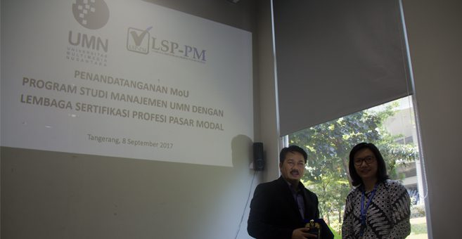 September 14, 2017Setelah penandatanganan MoU untuk sertifikasi di bidang manajemen operasional dan manajemen pemasaran, kini program studi manajemen kembali bekerjasama dengan Lembaga Sertifikasi Profesi Pasar Modal untuk mengadakan dua jenis sertifikasi. MoU tersebut ditandatangani pada Senin, (11/9) di Universitas Multimedia Nusantara.