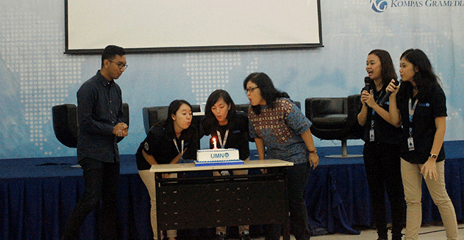 Sebelum memasuki acara Seminar, Ketua umum UMN Tv generasi 1, Fellya Hartono dan generasi 2, Yovita Debora bersama Ketua Prodi Ilmu komunikasi UMN, Dr. Bertha Sri Eko M., M.Si. melakukan sesi tiup lilin bersama. jumat (01/04).