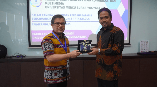Dekan Fakultas Ilmu Komunikasi UMN Dr. Rismi Juliadi, S.T., M.Si. (kiri) dan Dekan Fakultas Ilmu Komunikasi dan Multimedia UMB Yogyakarta Dr. Didik Haryadi Santoso, S.Kom.I., M.A. (kanan) menerima cenderamata dari kegiatan Studi Banding pada Rabu (05/02/25).