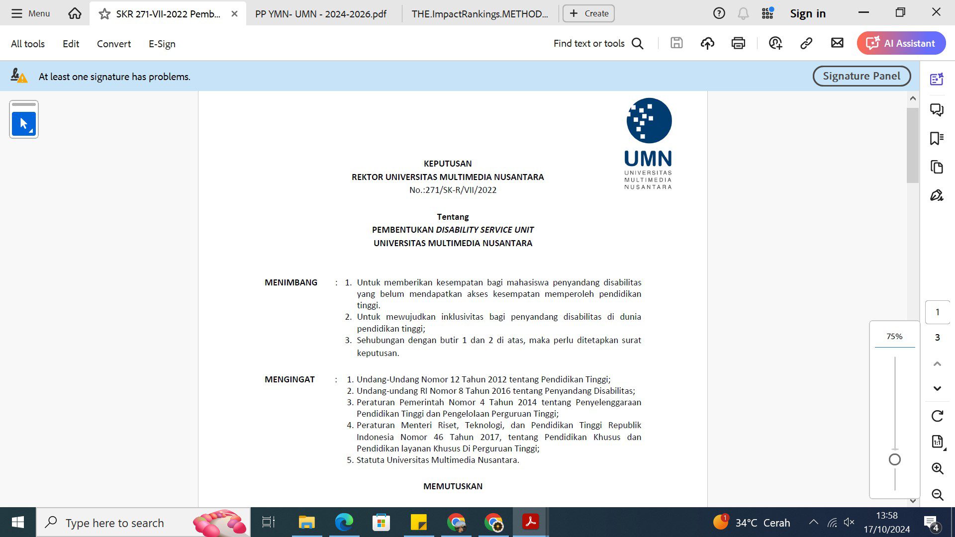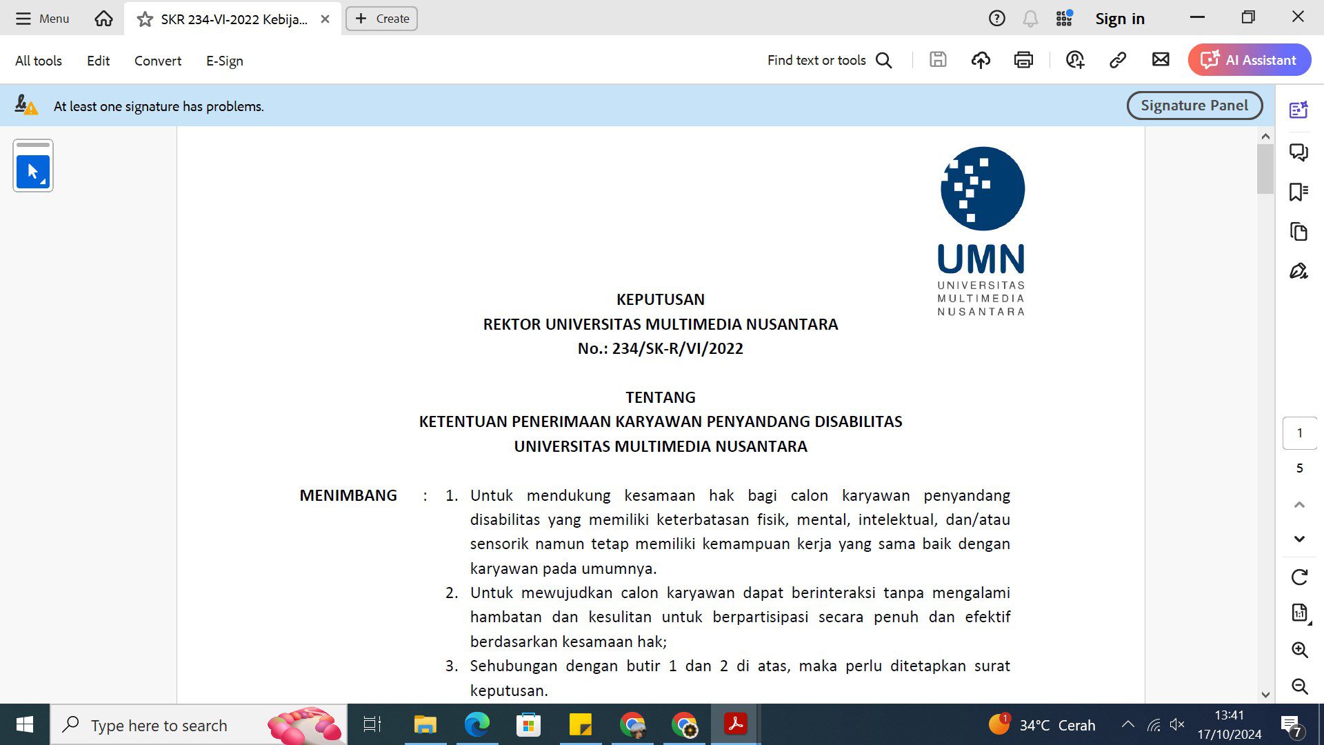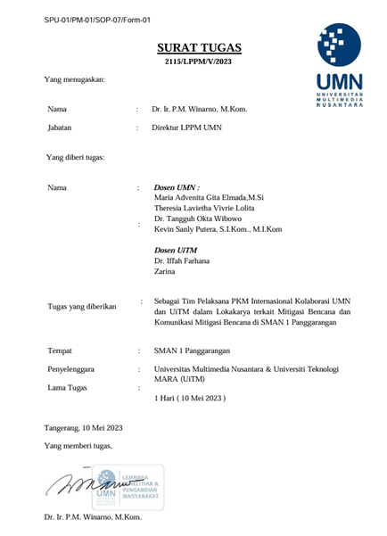 Universitas Multimedia Nusantara (UMN) is committed to upholding equality without discrimination based on ethnicity, race, religion, gender, physical ability, immigration status, or marital status. This commitment is outlined in the Employment Regulations of the Multimedia Nusantara Foundation, officially ratified by the Head of the Tangerang Regency Manpower Office, under Decree No. KEP. 4/HI.00.00/36.3603.230804008/B/II/2024.