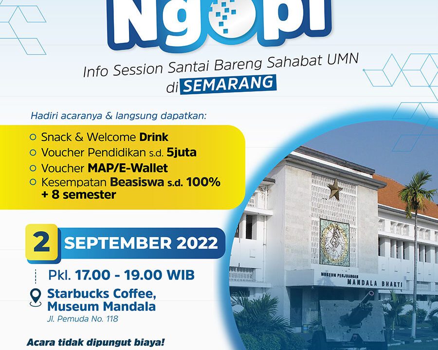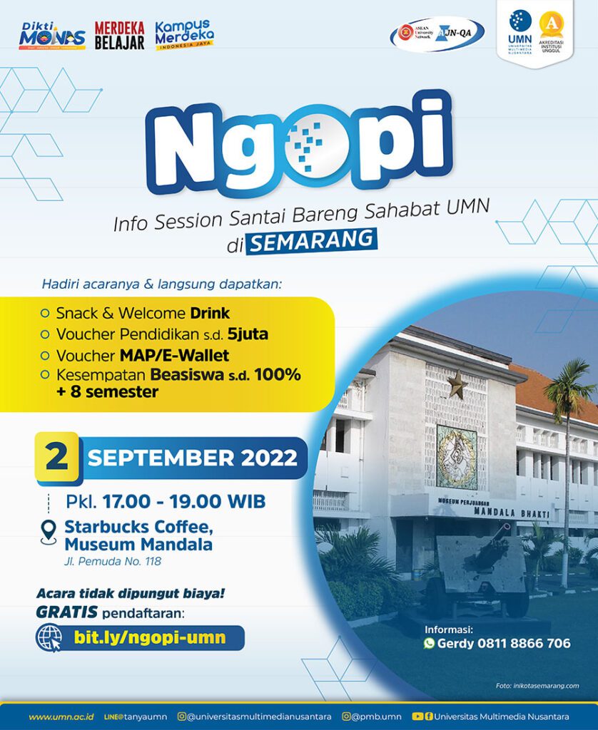 Agustus 19, 2022Published by umnadmin2 on Agustus 19, 2022Categories Ngopi Bareng Sahabat UMN di Semarang – 2 September 2022📣 Sahabat UMN Semarang mana suaranya?🙋🏻♀️🙋🏻♂️ UMN akan mengadakan ngopi bareng Sahabat UMN dan tes […]