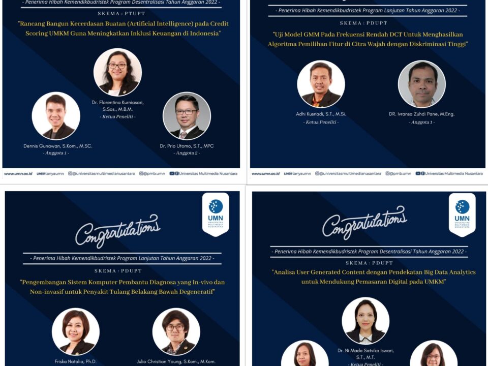 Mei 27, 2022Published by umnadmin on Mei 27, 2022Categories Berita General informatika Manajemen mmt Prestasi sisteminformasiTim Peneliti Dosen UMN Menerima Pendanaan Hibah Kemendikbud Ristek Program Desentralisasi dan Program Lanjutan Tahun Anggaran 2022TANGERANG – Tim peneliti dosen Universitas Multimedia Nusantara (UMN) menerima pendanaan penelitian hibah dari Direktorat […]