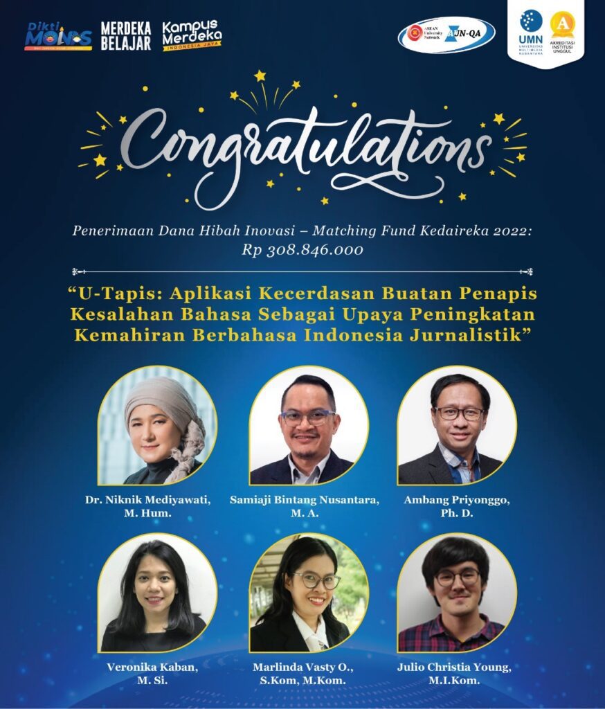 Agustus 24, 2022Published by umnadmin on Agustus 24, 2022Categories Berita GeneralTim Dosen UMN Menerima Hibah di Program Matching Fund Kedaireka 2022TANGERANG – Proficiat! Mengusung ide inovasi “U-Tapis: Aplikasi Kecerdasan Buatan Penapis Kesalahan Bahasa Sebagai Upaya […]