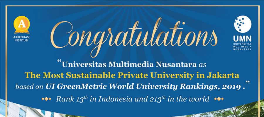 Desember 5, 2019Published by umnadmin on Desember 5, 2019Categories General green building PrestasiUMN Kembali Terpilih menjadi PTS Paling Hijau di Jakarta Tahun 2019TANGERANG – Berdasarkan riset UI GreenMetric World University Rankings 2019, Universitas Multimedia Nusantara (UMN) meraih […]