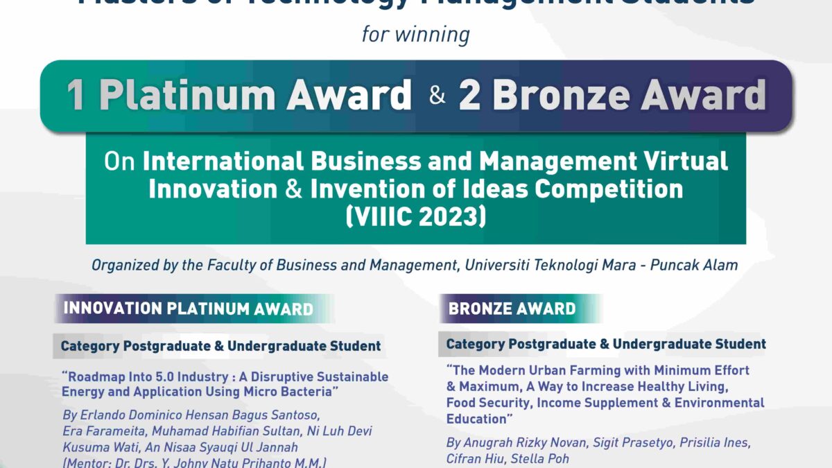 TANGERANG – Tiga tim mahasiswa MMT UMN berhasil menorehkan penghargaan masing-masing satu Innovation Platinum Award dan dua Bronze Award dalam “International Business and Management Virtual Innovation of Ideas Competition (VIIIC 2023)” pada Oktober 2023. Ketiga ide bisnis ini pun menawarkan solusi teknologi yang ramah lingkungan.