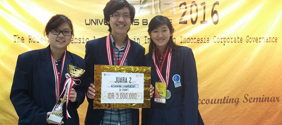 Maggy, Aina Claudia, dan Alvian, mahasiswa program studi Akuntansi UMN berhasil menjadi juara 2 dalam Lomba Akuntansi di ajang Accounting Fair Bakrie 2016.