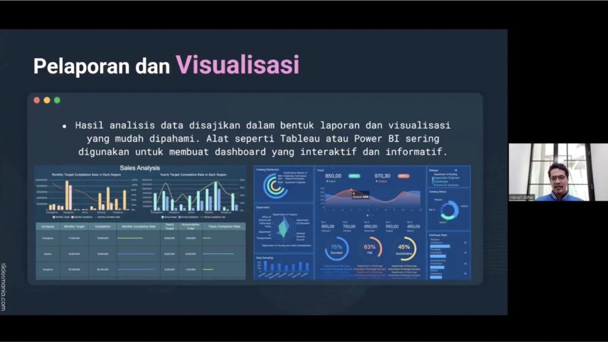 Selanjutnya, ia juga menjelaskan tentang bagaimana pelaporan dan visualisasi data agar data yang dihasilkan mudah dipahami. Biasanya dalam prosesnya para pekerja di bidang data menggunakan tools visualisasi data interaktif seperti Power BI dan Tableau, agar informasi dalam grafik atau dashboard yang dibuat lebih mudah dibaca.