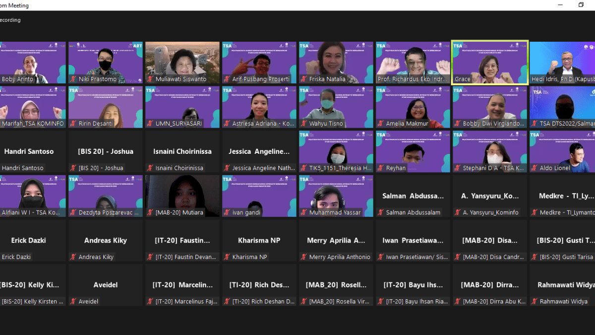 TANGERANG – Universitas Multimedia Nusantara (UMN) berkolaborasi dengan Digital Talent Scholarship Kementerian Komunikasi dan Informatika (Kominfo) RI menyelenggarakan pelatihan Data Science untuk mahasiswa. Pelatihan ini dibagi dalam tiga materi yaitu Data Visualization, Data Modeling, dan Data Warehouse pada semester 2021/2022. Pelatihan ini juga bekerjasama dengan Badan Litbang SDM, DQLab, dan Fakultas Teknik dan Informatika (FTI) UMN, diawali dengan pembukaan pelatihan tahap 1 ini melalui Zoom, Kamis (13/6/2022).