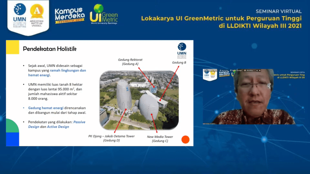 Terkait implementasi itu, Ir. Andrey Andoko, M.Sc. selaku Wakil Rektor Bidang Administrasi Umum dan Keuangan UMN diberi kesempatan untuk menjelaskan Pengelolaan Energi dan Perubahan Iklim, khususnya di UMN. Andrey menjelaskan bahwa pembangunan gedung UMN ini memang dari awal dirancang dengan konsep yang ramah lingkungan dan hemat energi. Hal ini meliputi penggunaan ventilasi dan pencahayaan alami, pemanfaatan Building Automation System (BAS) untuk memonitor peralatan listrik, pemanfaatan Internet of Things (IoT) untuk memantau kondisi bangunan, pemanfaatan berbagai teknologi energi bersih dan terbarukan, penanaman pohon di sekitar gedung, dan lain sebagainya.