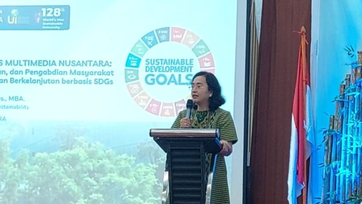 Prof. Florentina Kurniasari menyampaikan aksi keberlanjutan UMN di Sarasehan SDGs 2025 (Dok. RIS UMN)