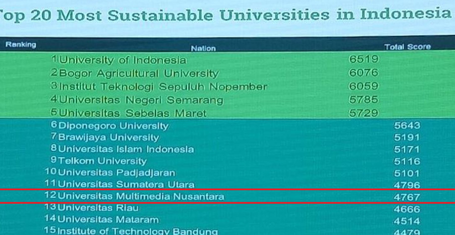 Desember 14, 2017Berdasarkan riset UI GreenMetric World University Rankings 2017, Universitas Multimedia Nusantara (UMN) meraih peringkat ke-12 kampus hijau terbaik di Indonesia dan peringkat ke-240 di dunia. Hal ini merupakan suatu peningkatan, setelah sebelumnya UMN meraih peringkat ke-16 di Indonesia dan peringkat ke-282 di dunia tahun 2016.