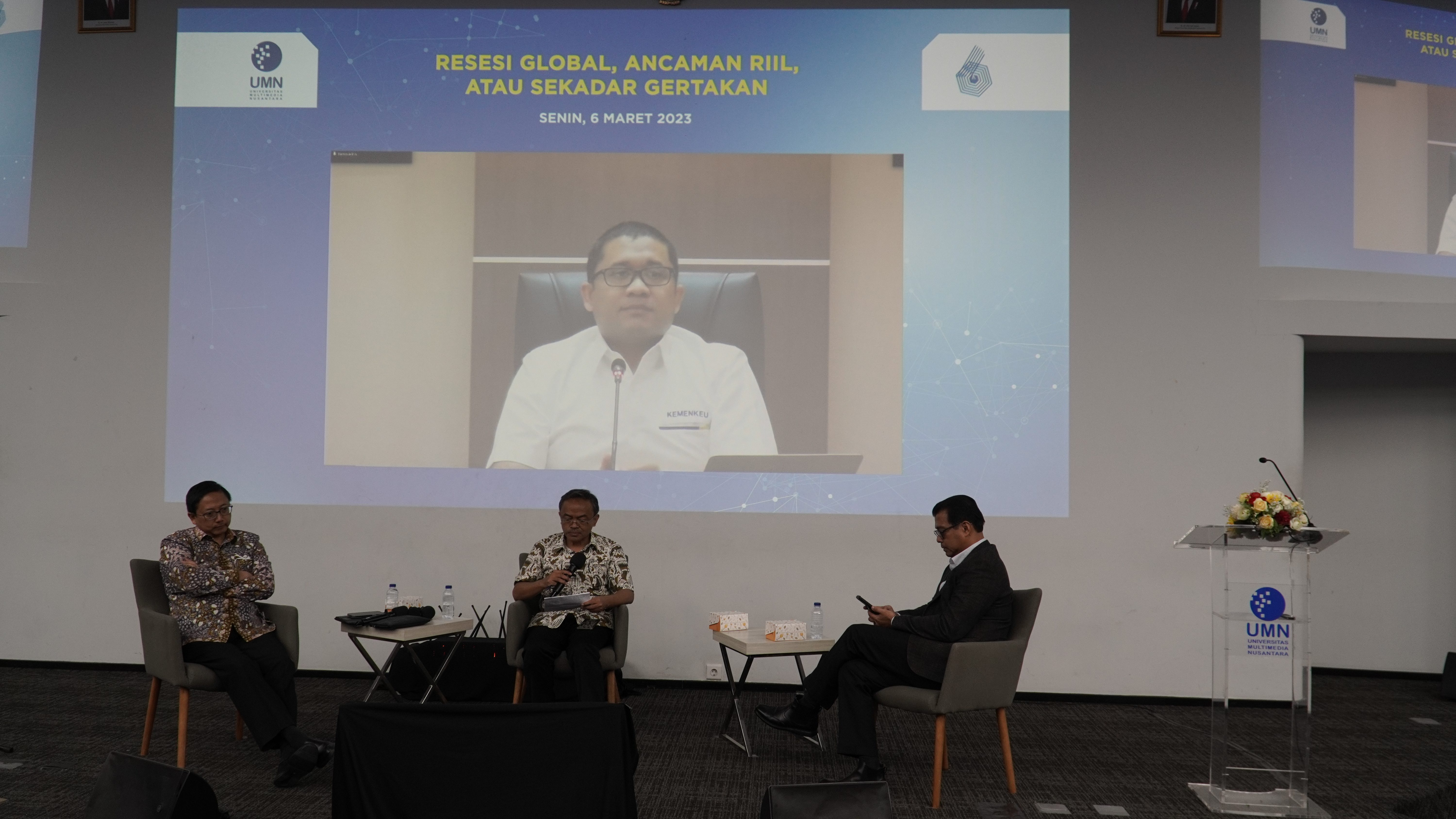 Tangerang- Webinar bertema “Resesi Global, Ancaman Riil atau Sekadar Gertakan” diselenggarakan pada Senin, 6 Maret 2023 di Lecture Theater UMN. Webinar tersebut mengundang Gubernur Lemhannas Andi Widjajanto, Kepala Badan Kebijakan Fiskal (BKF) Kemenkeu Febrio Kacaribu, Rektor Unika Atma Jaya Dr. Agustinus Prasetyantoko, Duta Besar Indonesia untuk Singapura Suryopratomo, dan Komisaris PT Bursa Efek Indonesia Pandu Sjahrir. Acara yang berlangsung sebagai agenda HUT Kompas.id keenam itu terbagi menjadi dua shift yang dipandu oleh Antonius Tomy Trinugroho dan Andreas Maryoto. Keduanya adalah Wakil Redaktur Pelaksana Harian Kompas.